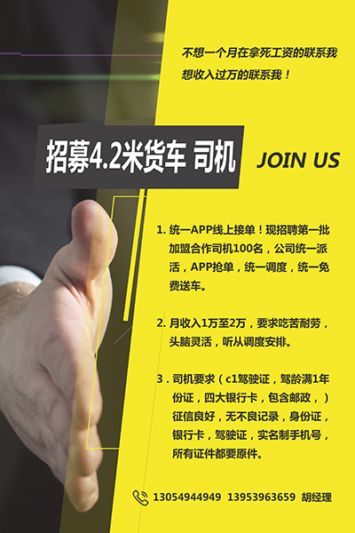招募4.2米货车 司机,不想一个月在拿死工资的联系我,想收入过万的联系我!